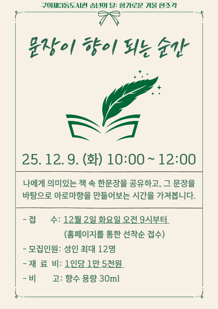 ■ 송년의 달 행사 <문장이 향이 되는 순간> 안녕하세요! 구의제3동도서관입니다. 아직 2025년에 익숙해지지 않은 것 같은데, 벌써 12월이 되었습니다. 한 해를 보내는 동안 여러분 곁을 지켜준 책은 어떤 책이었나요? 그리고 그 책 속에서 기억나는 한 문장이 있었나요? 있었다면, 무엇이었나요? 이번 송년 프로그램으로 준비한 <문장이 향이 되는 순간>에서는 그 문장을 바탕으로 아로마향을 제작해 보는 시간을 가지려 합니다. 관심있는 이용자분들의 많은 신청 바랍니다. - 일시: 2025. 12. 9.(화) 10:00~12:00 - 모집: 2025. 12. 2.(화) 09:00~마감 시 - 운영대상: 성인 12명 - 운영장소: 구의제3동주민센터 5층 대강당 - 문 의: ☎02-454-6294 (담당사서: 이혜림) - 신청방법: 구의제3동도서관 홈페이지(온라인신청>문화프로그램신청) ※온라인 선착순 접수 ※반드시 프로그램 참여자 본인 이름으로 신청하시기 바랍니다