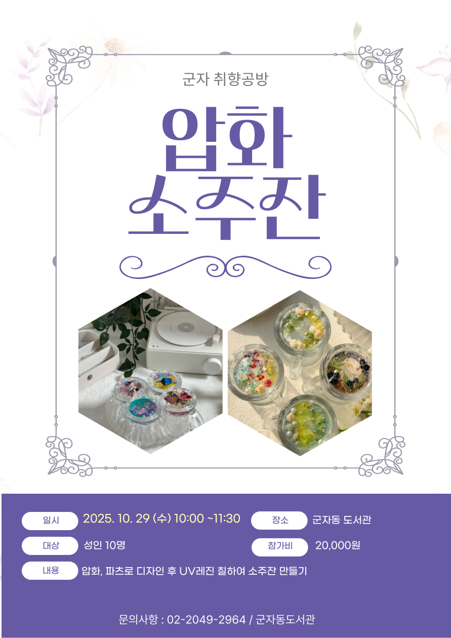 [군자 취향공방] 10월: 압화 소주잔 **매월 마지막 주 수요일 '문화가 있는 날'에 진행되는 체험프로그램입니다. 군자 취향공방 10월: 압화 소주잔 ◎ 일시: 2025.10.29.(수) 10:00~11:30 ※ 개인에 따라 시간 차가 발생할 수 있습니다. ◎ 장소: 군자동도서관 강의실 '소란' ◎ 대상: (대출회원/도서관 정회원-홈페이지만 가입 불가) 성인, 10명 ◎ 내용: 압화 소주잔 ◎ 작품 예시 확인: 포스터 이미지 참조 ◎ 재료비: 20,000원 ◆ 유의사항 - 한 아이디 당 한 명만 신청 가능합니다. (참여자 본인 아이디★로 신청해주세요!) - 신청자 모집 완료 후 재료비는 강사님 계좌로 직접 입금 안내 문자드릴 예정입니다. - 납부하신 재료비는 프로그램 취소 시 환불이 어려우니, 꼭!! 일정을 잘 확인하신 후 신청해주시기 바랍니다. - 입금 기한 안내일까지 입금이 되지 않을 경우 신청이 취소될 수 있음을 미리 안내드립니다. - 결과보고 및 홍보를 위해 사진촬영이 있을 수 있으며, 프로그램 신청 시 동의하신 것으로 간주됩니다. ◎ 문의처: 02-2049-2964(취향공방 담당자)