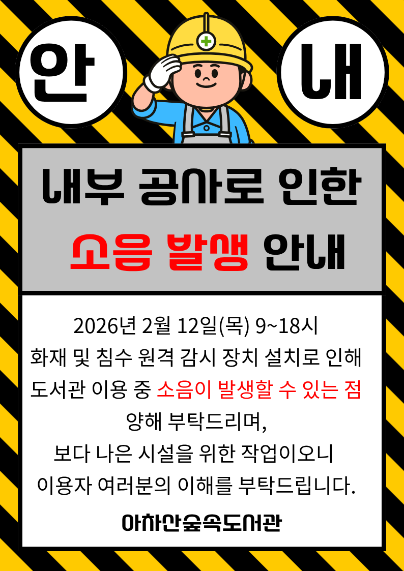 | [아차산숲속도서관] 도서관 건물 내부 공사로 인한 소음 발생 안내 | |