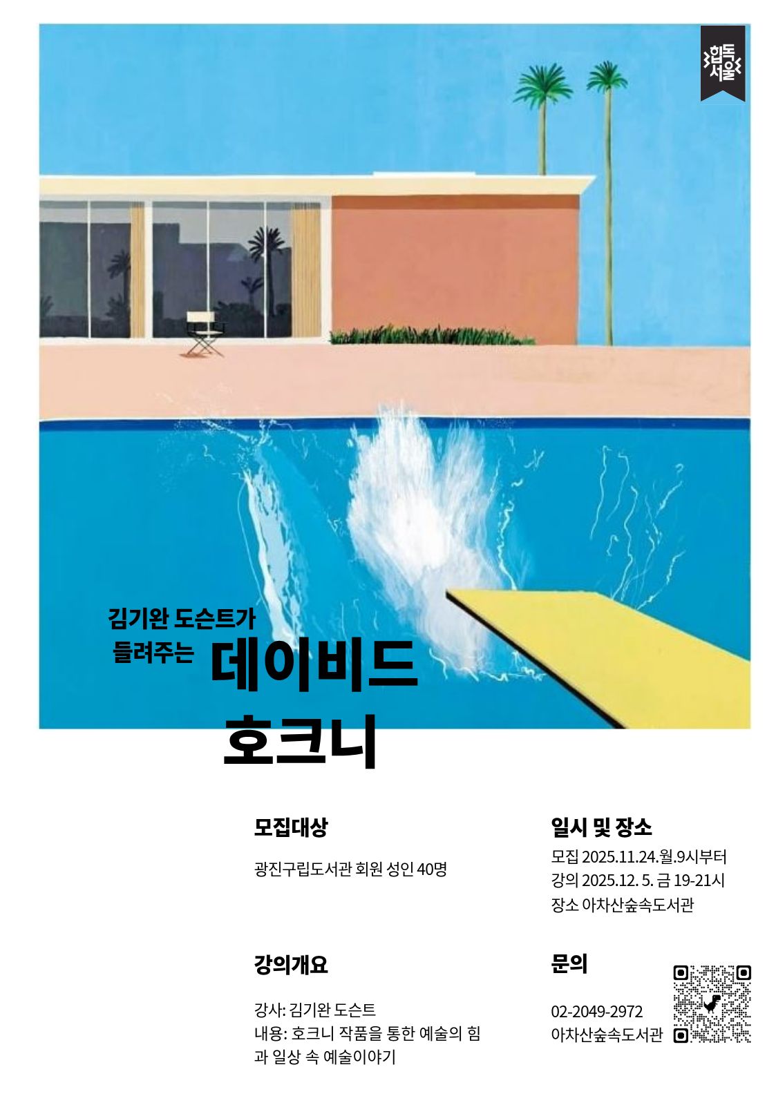 김기완 도슨트가 들려주는 “데이비드 호크니” 예술로 일상을 바꾸는힘 데이비드 호크니의 작품을 통한 예술의 힘과 일상 속 예술 이야기를 들려주는 도슨트 강연 - 모집일시: 2025.11.24.(월) 9시~ - 강의일시: 2025.12.5.(금) 19시~21시(2시간) - 대상: 도서관 이용자 성인 40명 - 강사: 김기완 도슨트 |