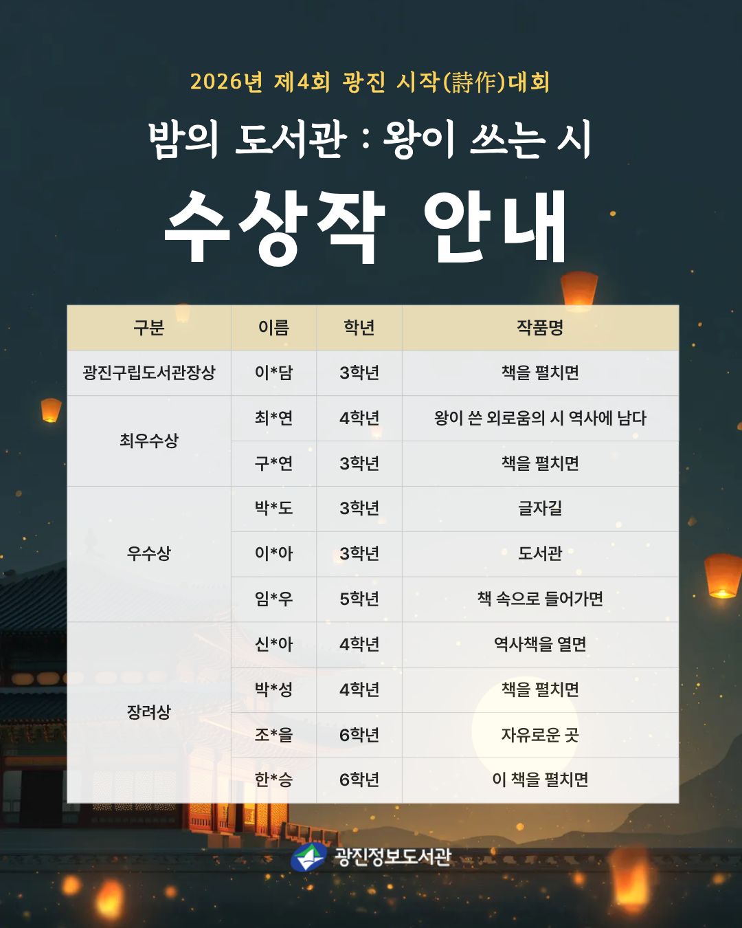 | [도서관 주간] <제4회 광진 시작(詩作) 대회> 수상자 안내 | |