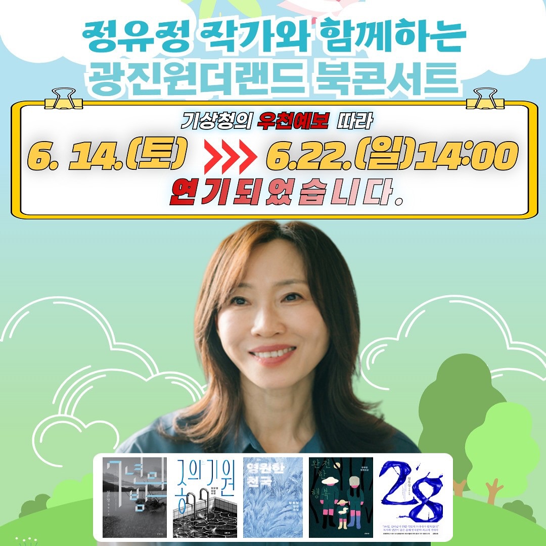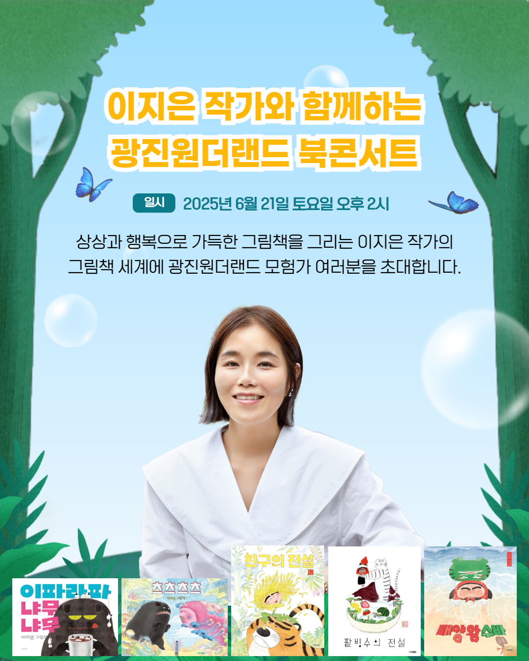 📖 광진 원더랜드 북콘서트 운영 안내 ![]() 2. 이지은 작가와의 만남 - 모집방법: 사전접수 15팀(2인 기준), 현장접수 15팀 - 모집일시: 6/14(토) 09시~ - 모집링크 바로가기: 클릭 시 이동 ![]() [광진 원더랜드]에서 운영되는 북콘서트에 광진구립도서관 이용자 여러분의 많은 관심과 참여 부탁드립니다. - 비가 오는 날에는 프로그램이 취소될 수 있으니, 당일 날씨와 공지 사항을 확인해 주세요. 공지는 인스타그램을 통해 확인 가능합니다.* 광진 원더랜드(서울어린이대공원) 찾아오는 길 : 바로가기 : 지도에서 '서울어린이대공원 게이트볼장'를 검색하시면 야외도서관 입구까지 빠르게 찾아오실 수 있습니다! * 서울 야외도서관, 광진 원더랜드(@gwangjinoutdoorlibrary) • Instagram 사진 및 동영상 |