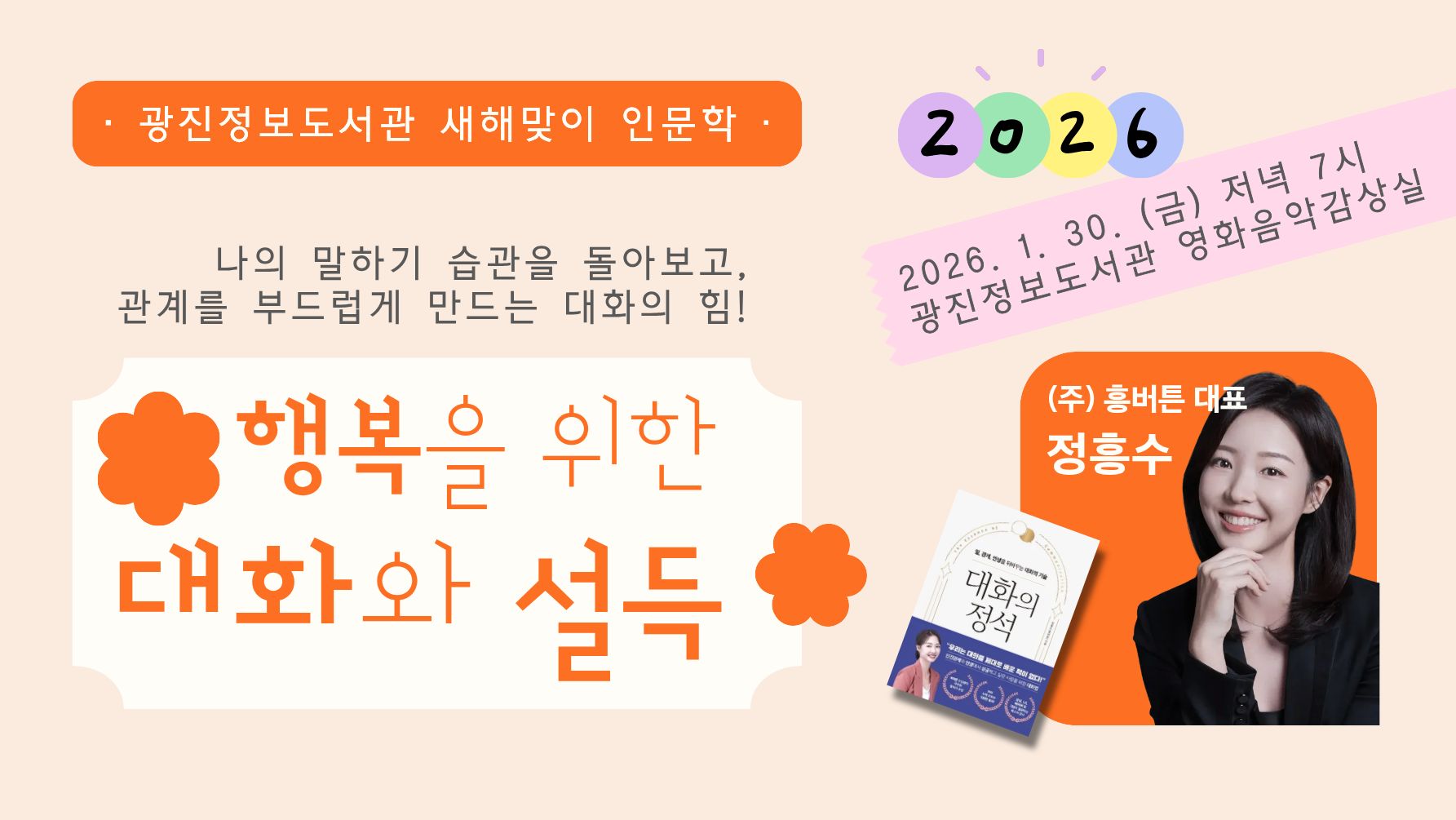 ※‼️온라인 신청 마감되었습니다. 현장 참여도 가능하니 참여를 원하시는 분은 시간 맞춰 강의 장소로 와 주시기 바랍니다.![]() 광진정보도서관 새해 인문학 <행복을 위한 대화와 설득> 새해를 맞아 나의 말하기 습관을 돌아보고, 관계를 더 부드럽게 만드는 <대화의 힘>을 만나보세요. 일상과 직장, 가족 관계 속 다양한 대화 상황을 중심으로 진심을 잘 전하는 말하기와 상대의 마음을 움직이는 설득의 원리를 함께 살펴봅니다. 14년 차 커뮤니케이션 강사인 정흥수 작가와 함께, 더 따뜻한 관계를 만들어가는 시간을 마련했습니다. ■신청: 1월 12일 월요일 09:00~(홈페이지 선착순 모집) ■일정: 1월 30일 금요일 19:00~20:30(1.5시간) ■주제도서: 강사의 저서(『대화의 정석』 및 『설득자』) ■장소: 광진정보도서관 문화동 영화음악감상실 ■문의: 02-2049-2940(담당사서: 김영의) ♣ 개인 일정을 확인하신 후, 참여 가능하신 분에 한해 신청해 주시기 바랍니다. ♣ 1개 아이디로 최대 2명까지 신청 가능하며, 본인 명의 아이디로만 신청해 주시기 바랍니다. ♣ 본 강연은 성인 대상 프로그램으로 구성, 그 외 대상은 초등 고학년~중학생 이상 참여 가능합니다. (유아 및 초등 저학년 불가) ♣ 프로그램 안내는 등록된 연락처로 문자 발송되오니, 연락 가능한 번호를 기재해 주시기 바랍니다. |