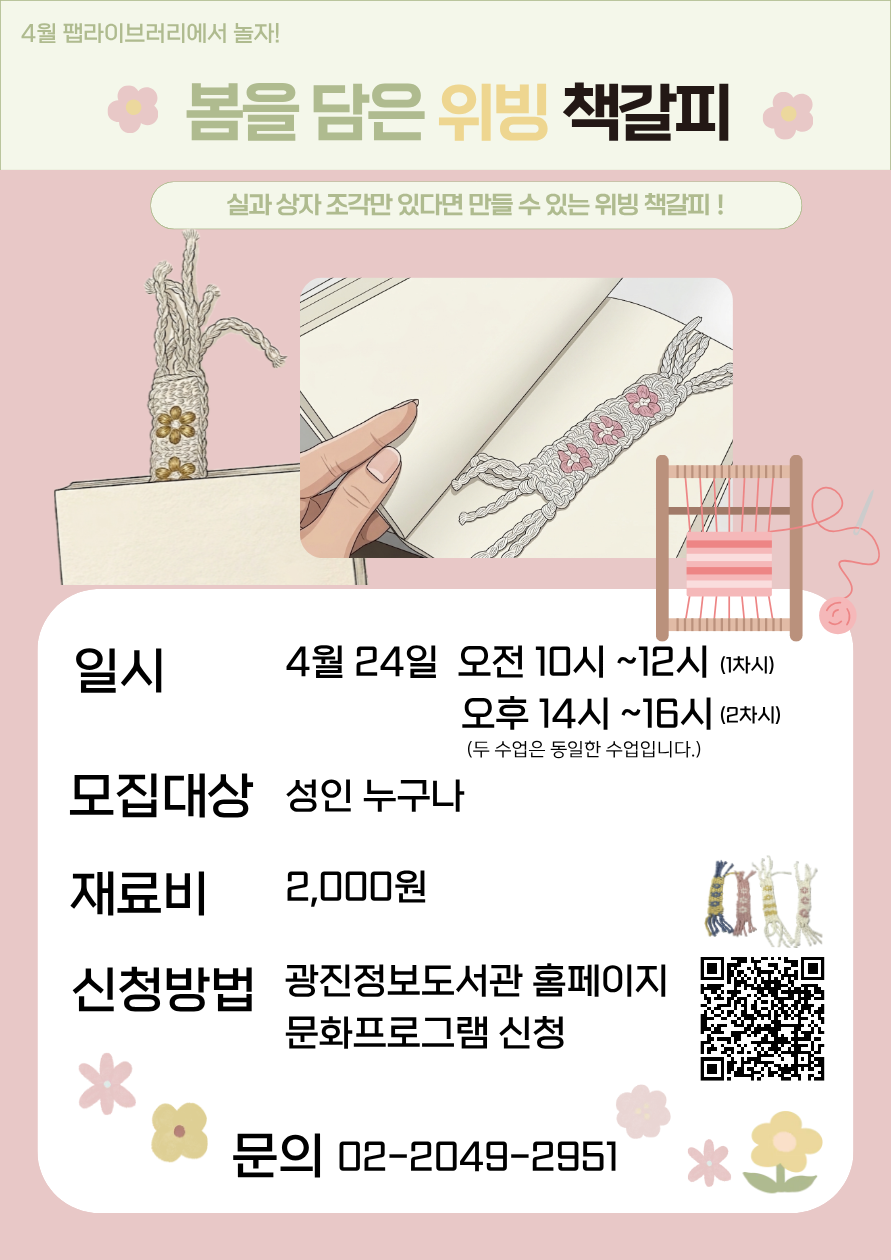 | 비고 | [팹라이브러리에서 놀자!] 봄을 담은 위빙 책갈피 만들기 (10시~12시) |