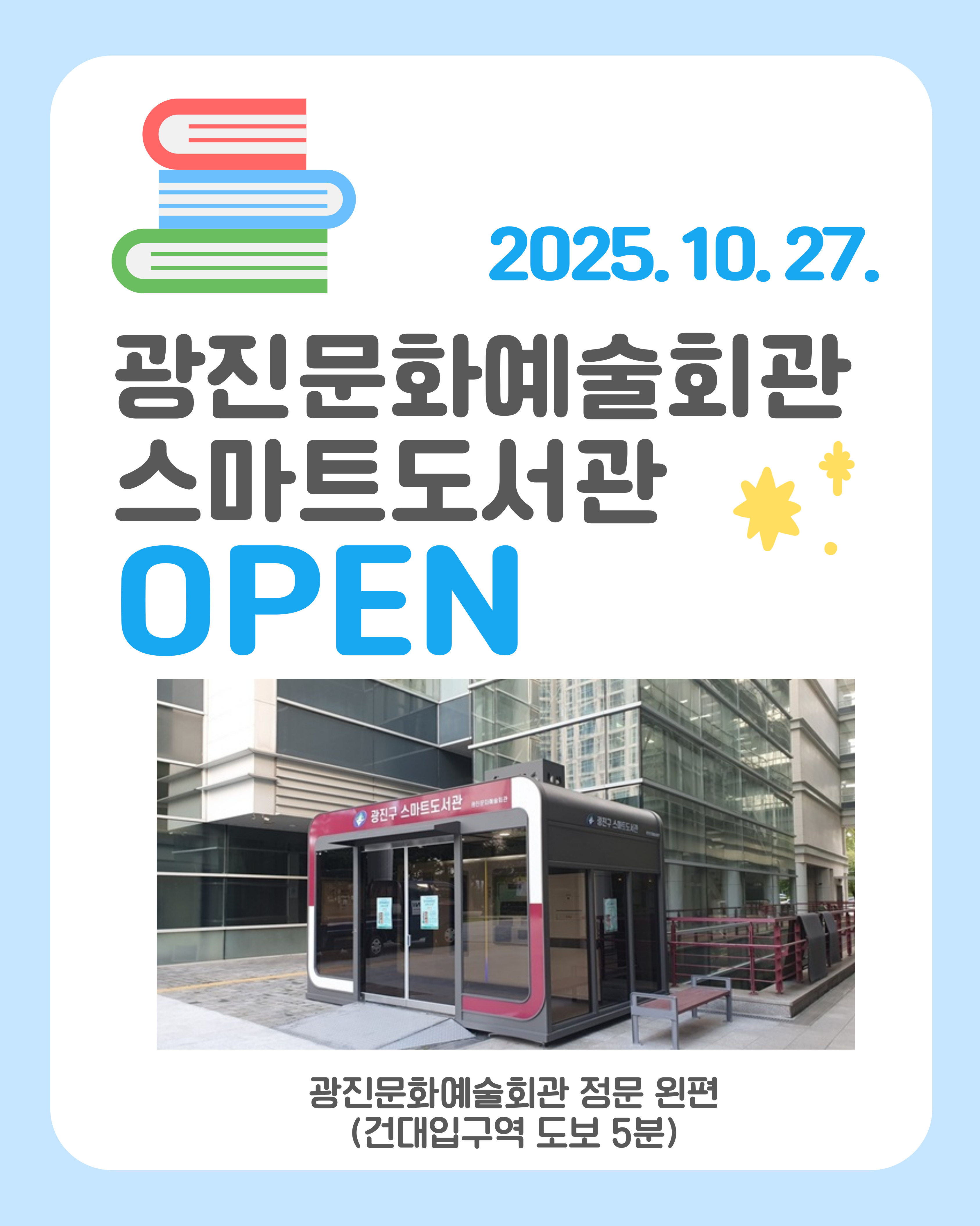 ![]() ![]() 안녕하세요. 광진정보도서관입니다. '광진문화예술회관 스마트도서관'이 운영을 시작합니다. 이용자분들의 많은 이용 바랍니다. 운영일시: 2025년 10월 27일 오전 9시~ 운영위치: 광진문화예술회관 정문 왼편(건대입구역 도보 5분거리) 운영시간: 365일 24시간 운영(상호대차 투입시간 제외 10:00~12:00) 제공 서비스: ① 책 자판기 - 250여권의 신착, 베스트셀러 도서 비치 - 1인 2권, 14일간 대출 가능(반납연장 가능) - 광진구립도서관 대출권수에 미포함 - 책 자판기 도서는 해당 책 자판기에서만 반납가능 ② 상호대차 - 군자역, 구의역, 광진구민체육센터 스마트도서관과 같이 상호대차 신청 가능 - 광진구립도서관 대출 권수에 포함 ③ 무인반납 - 광진구립도서관 도서 반납 가능(아차산숲속도서관 제외) 기계에 도서 인식 후, 오른쪽 하얀색 무인반납기기에 투입 문의전화: 광진정보도서관 종합자료실 02-3437-5092~5(내선:2912) |