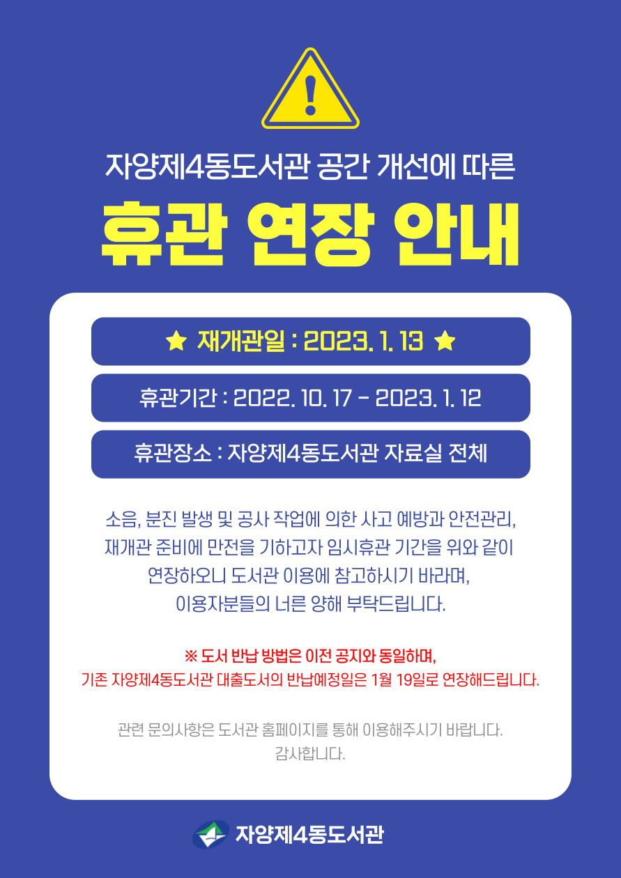 ![]() 안녕하세요. 자양제4동도서관 입니다. 소음, 분진 발생 및 공사 작업에 의한 사고 예방과 안전관리, 재개관 준비에 만전을 기하고자 임시휴관 기간을 연장하오니 도서관 이용에 참고해주시기 바라며, 이용자분들의 너른 양해 부탁드립니다. ★ 재개관일 : 2023년 1월 13일 금요일 ※ 도서 반납 방법은 이전 공지와 동일하며, 기존 자양제4동도서관 대출도서의 반납예정일은 2023년 1월 19일로 연장해드립니다. 관련 문의사항은 홈페이지 게시판을 통해 이용해주시기 바랍니다. 조금만 더 기다려주시면 안전하고 쾌적한 환경으로 다시 만나뵙도록 하겠습니다. 감사합니다. |