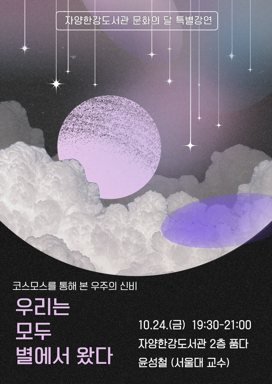 ![]() 자양한강도서관 문화의 달 특별강연 우리는 모두 별에서 왔다 자양한강도서관에서는 문화의 달을 맞이하여 칼세이건의 '코스모스'를 읽고 해당 도서를 좀 더 자세히 이해하기 위한 시간을 마련했습니다. 관심있는 분들의 많은 참여 바랍니다. 🌌 일시: 10. 24.(금) 19:30 ~ 21:00 🌌 장소: 자양한강도서관 2층 품다 🌌 대상: 해당 도서에 관심있는 청소년 이상 30명 - 해당 프로그램은 <책 읽을 결심: 코스모스>의 참여자분들의 우선접수가 진행되었음을 알려드립니다. 🌌 강연: 윤성철 (서울대학교 물리천문학부 교수) 🌌 내용 - 칼 세이건의 명저 '코스모스'가 탄생할 수 있었던 과학적/시대적 배경 알아보기 - 별과 인간 존재의 연관성, 우주 진화 속 인류의 위치 성찰 등 🌌 모집: 10. 11.(토) 9시 ~ 🌌 문의: 02.456.0048 (내선 4703) |