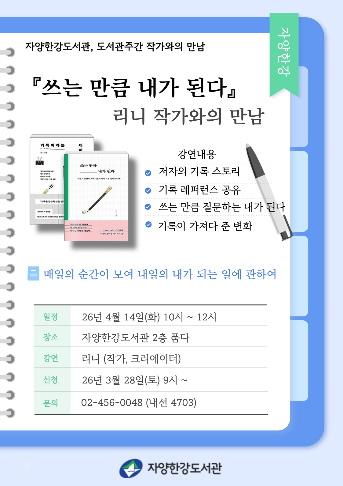 자양한강도서관에서는 도서관주간을 맞이하여「기록이라는 세계」, 「쓰는만큼 내가된다」의 ''리니' 작가님을 모시고'매일의 순간이 모여 내일의 내가 되는 일에 관하여' 라는 주제로 기록을 통해 생각을 확장해보는 시간을 갖고자 합니다.