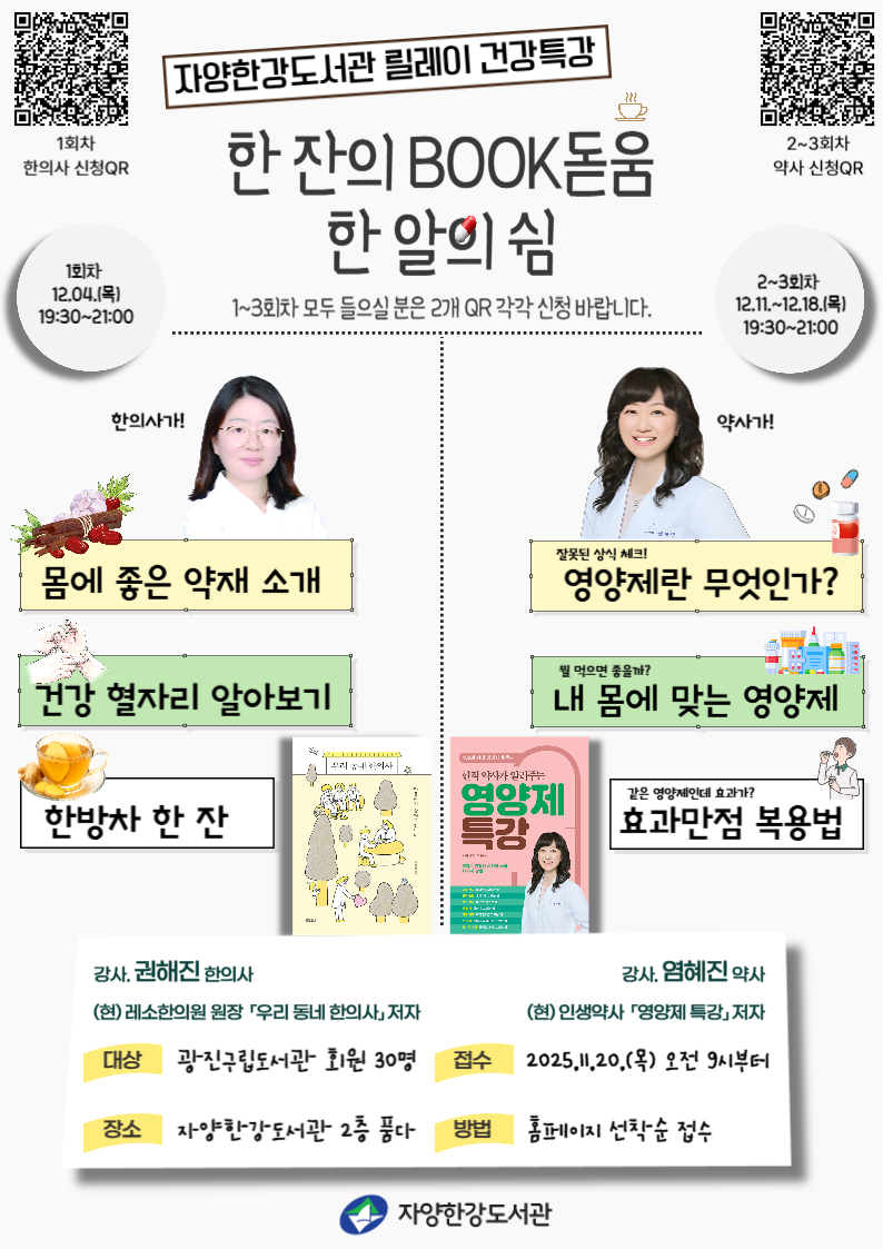 ![]() 자양한강도서관 연말 / 신년 맞이 건강특강 진행 한 잔의 BOOK돋움 한 알의 쉼 자양한강도서관에서는 연말 맞이 및 다가오는 신년을 맞이하여 한의사와 약사 선생님들을 모시고 총 3회차의 건강 특강 시간을 마련했습니다. 평소 알고 싶었던 약 관련 지식과 건강 지식들 / 잘못된 정보 교정과 다양한 약재 체험, 한방차 시음까지! 관심있는 분들의 많은 참여 바랍니다. 🌌 일시: 12. 4.(목) 1회차, 12.11(목) 2회차, 12.18(목) 3회차 19:30 ~ 21:00 🌌 장소: 자양한강도서관 2층 품다 🌌 대상: 건강에 관심 많은 도서관 회원 30명 🌌 강연: 권해진 (레소한의원 원장), 염혜진(인생약사) - 1~3강을 모두 듣거나 평소 관심 있었던 의학(양방, 한방) 중 골라 들으실 수 있도록 신청 링크가 2개입니다. - 1~3강 다 들으시려는 분은 각각의 링크에 모두 신청 바랍니다. 🌌 내용 - 몸에 좋은 약재 소개 / 건강 혈자리 알아보기 / 한방차 마시기 (1강) - 영양제란 무엇인가? / 영양제에 대해 잘못 알려진 사실들 (2강) - 내 몸에 맞는 영양제 찾기 / 효과만점 영양제 복용법 (3강) 🌌 모집: 11. 20.(목) 9시 ~ 🌌 문의: 02.456.0048 (내선 4717) |